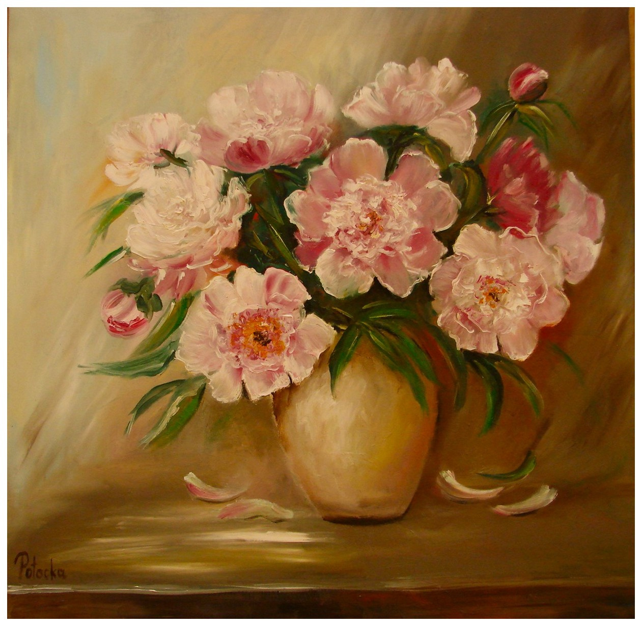 Obraz przedstawia bukiet różowych piwonii w jasnym wazonie. Kwiaty są pełne, a ich płatki zdają się być miękkie i delikatne niczym puch. Dominują pastelowe odcienie różu i zieleni, które harmonijnie kontrastują z neutralnym tłem. Kompozycja jest klasyczna, ale niezwykle urokliwa, jakby czas zatrzymał się w chwili pełni lata. Obraz emanuje spokojem i subtelnością, przywołując wspomnienia wakacyjnych dni.