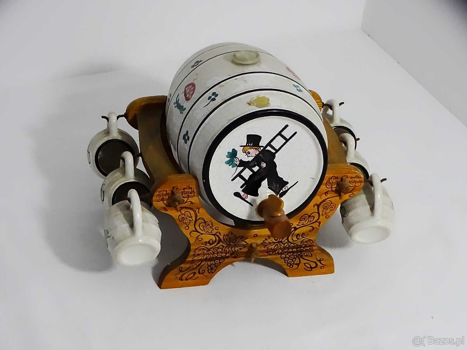 Ozdoba bardzo mało używana w bardzo dobrym stanie co widać na zamieszczonych zdjęciach. Ceramiczny dystrybutor napojów w kształcie beczki, osadzony na rzeźbionym stojaku drewnianym, z sześcioma kubkami dekoracyjnymi. To nie tylko funkcjonalny sprzęt do serwowania trunków, ale też unikatowy element dekoracyjny z nutą folkowo-retro. Oto pełne zestawienie: