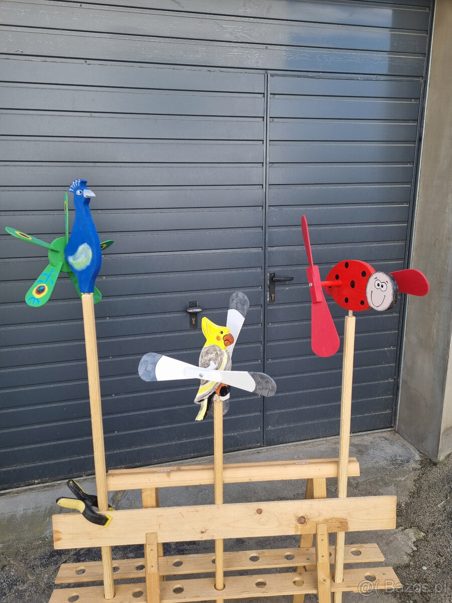 Wiatrak ogrodowy wykonany z drewna , skrzydła (śmigła) ze sklejki, solidnie połączony śrubami.
