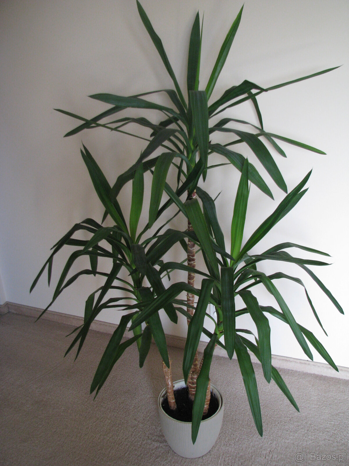 Sprzedam jukę – trzy-pienny zielony kwiat doniczkowy o wysokości ok. 160 cm z 3 wierzchołkami gęstego pióropusza dekoracyjnych liści.