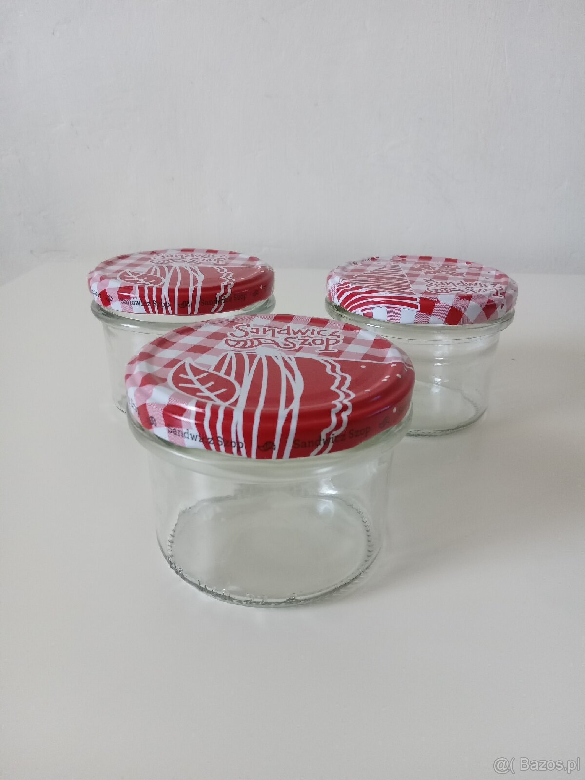 Zestaw pięciu dekoracyjnych słoików z czerwono-białymi i niebiesko-bialymi wzorzystymi pokrywkami. Słoiki wykonane są ze szkła, co nadaje im elegancki wygląd. Mogą być wykorzystywane do przechowywania różnych produktów lub jako dekoracja wnętrza.