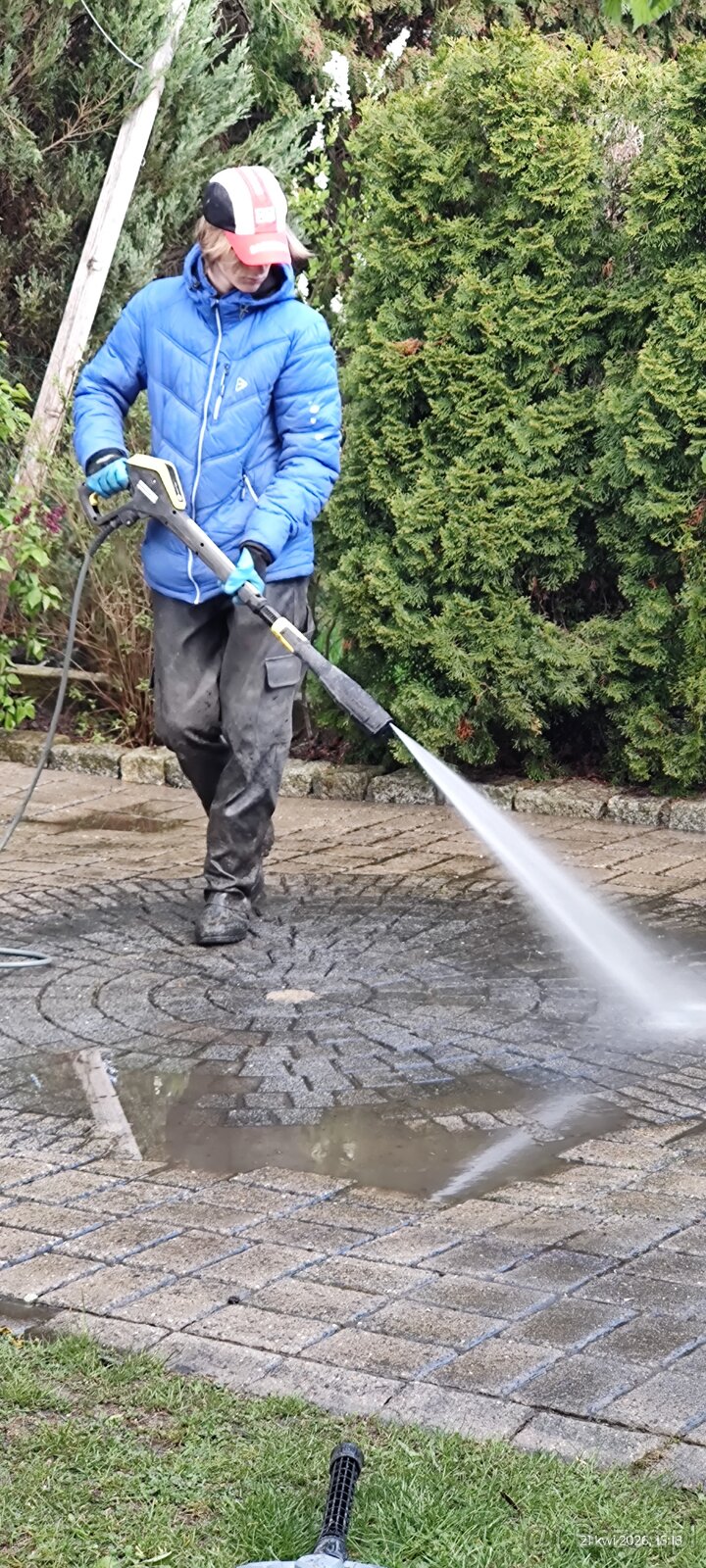 Wykonuję szybko i dokladnie czyszczenie kostki brukowejmyjką ciśnieniową Karcher K7.